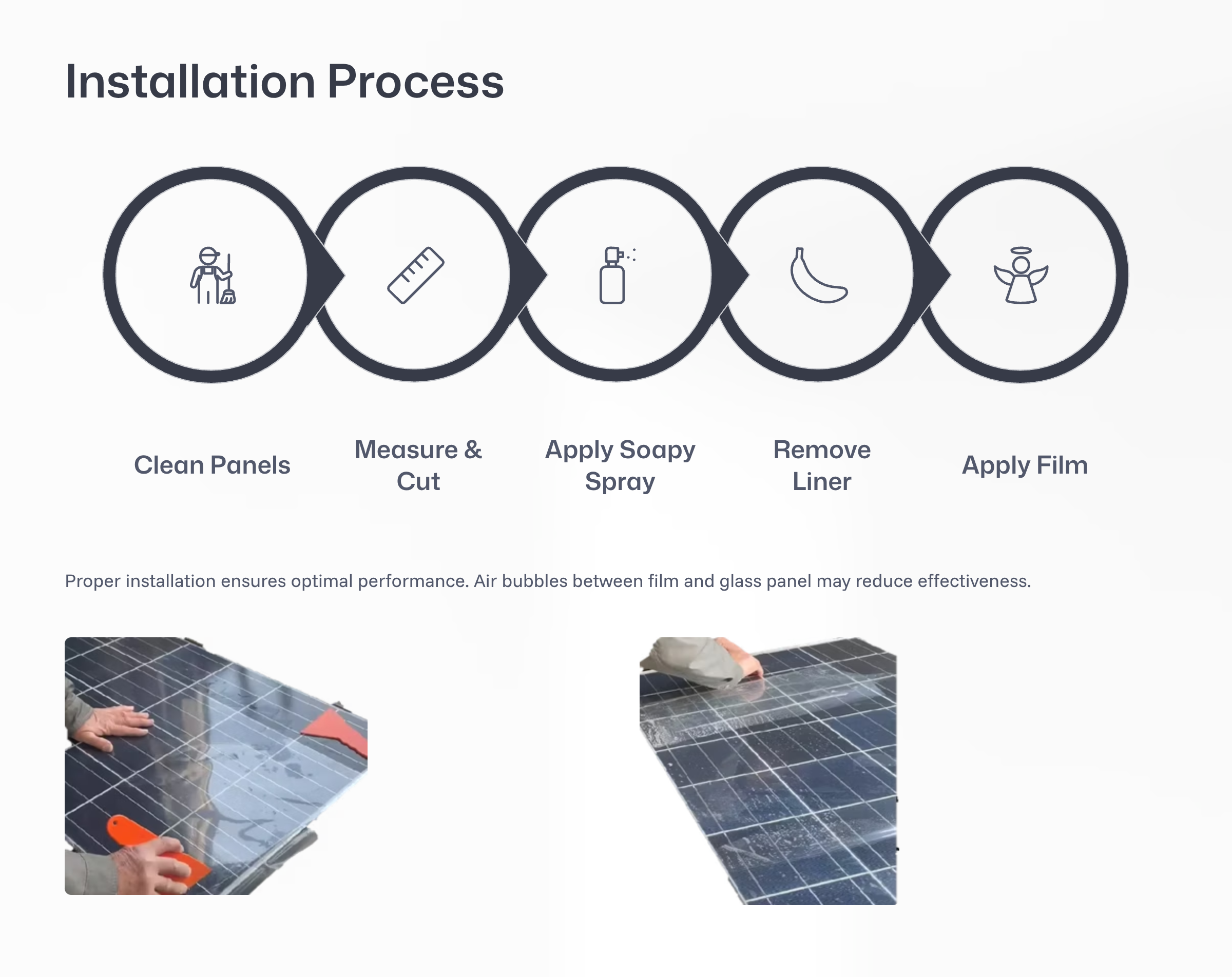 Air bubbles between the film and the panel may affect performance and should be removed during installation.